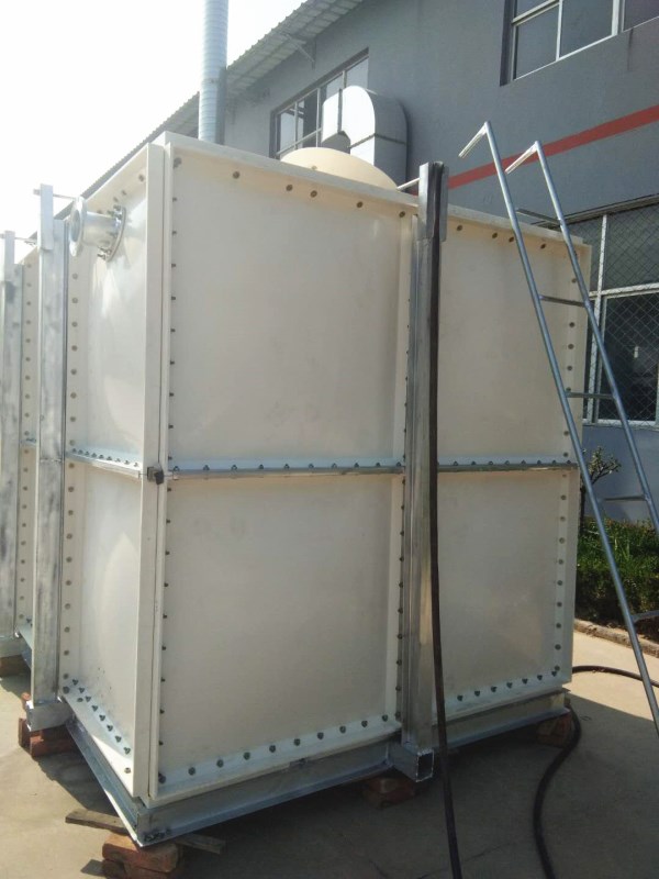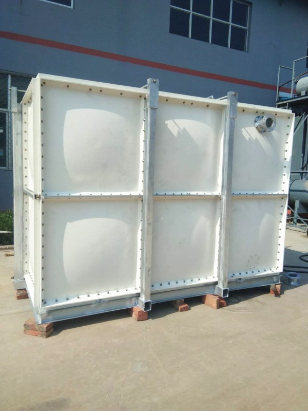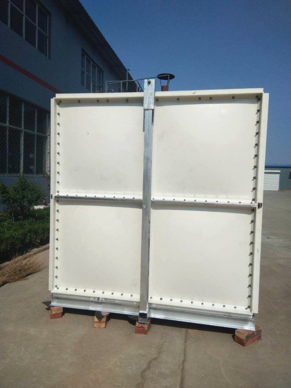 玻璃鋼水箱設(shè)計(jì)內(nèi)加強(qiáng)結(jié)構(gòu)型式,水箱箱體為型板裝配氬弧焊接而成,型板拼裝交叉部位設(shè)計(jì)雙向加強(qiáng)聯(lián)桿。箱體側(cè)板與底板間設(shè)置垂直加固柱,水箱側(cè)板四周外每層相鄰。型板間設(shè)置水平加強(qiáng)板,加強(qiáng)材料同箱體材料。水箱底部設(shè)置鍍鋅槽鋼支架。水箱附件有檢查孔、內(nèi)外扶梯、工藝管口、材料均為不銹鋼,水箱工藝管口按用戶提供的圖樣設(shè)計(jì)。