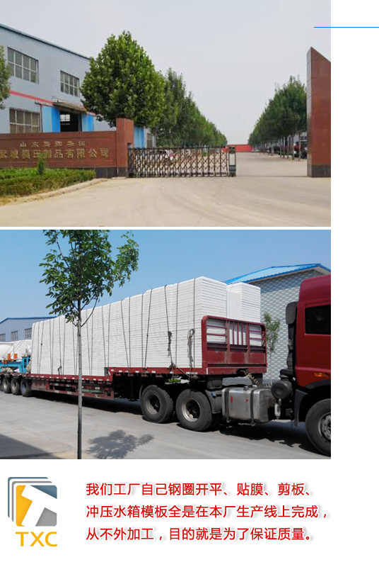 ![]() | 15年水箱工程設(shè)計、生產(chǎn)、安裝施工經(jīng)驗 山東省騰翔集團(tuán)武城模壓制品有限公司(TXC),坐落于素有“九達(dá)天衢、神京門戶”美譽之稱的美麗德州,公司主營業(yè)務(wù)為水箱、通風(fēng)空調(diào)設(shè)備、精密玻璃鋼外殼產(chǎn)品。水箱產(chǎn)品包括:不銹鋼水箱、SMC玻璃鋼水箱、熱鍍鋅鋼板水箱、搪瓷鋼板水箱、噴塑鋼板水箱、BDF復(fù)合板地埋水箱及各種模壓配件、鍍鋅風(fēng)管、通風(fēng)設(shè)備等配套產(chǎn)品,同時可提供水箱的設(shè)計、生產(chǎn)、安裝一條龍服務(wù)及大型不銹鋼板、各種鐵板開平服務(wù)。精密玻璃鋼外殼產(chǎn)品包括:精密醫(yī)療器械外殼、工程機(jī)械外殼及汽車外殼等多種系列,并具備定制、生產(chǎn)、實驗、電氣元件裝配及檢測能力,其中SMC、玻璃鋼纏繞、雙面模RTM、真空袋RTM及玻璃鋼手糊(HLU)等多種生產(chǎn)工藝均達(dá)到合作認(rèn)可,公司開展對銷貿(mào)易和轉(zhuǎn)口貿(mào)易,主要出口到歐美等國家,現(xiàn)已與東南歐洲等國家建立良好的長期貿(mào)易往來,已實現(xiàn)了出口有市場、銷售有網(wǎng)絡(luò)。本著用戶至上互惠互利、質(zhì)量好、以誠相待的原則和宗旨熱烈歡迎各界廠家和個人前來洽談貿(mào)易和各種形式的經(jīng)濟(jì)合作。 經(jīng)過公司員工的不懈努力,公司現(xiàn)已成為安全生產(chǎn)標(biāo)準(zhǔn)化三級企業(yè),武城玻璃鋼暨新材料企業(yè)聯(lián)盟會員,武城縣玻璃鋼復(fù)合材料協(xié)會會員,符合ISO9001:2015質(zhì)量管理體系認(rèn)證,健康與安全認(rèn)證,符合GB/T24001-2004idt ISO14001:2004環(huán)境管理體系認(rèn)證,不銹鋼飲用水箱通過上海機(jī)械研究所檢驗,并通過了山東省國產(chǎn)涉及飲用水衛(wèi)生安全產(chǎn)品衛(wèi)生許可批件”,2013年固定資產(chǎn)投入先進(jìn)企業(yè),2018年度轉(zhuǎn)型升級進(jìn)步獎,2018年度在環(huán)保工作中獲得具有社會責(zé)任企業(yè)獎,2018年度全縣產(chǎn)業(yè)發(fā)展“雙創(chuàng)”示范企業(yè),2019年度納稅先進(jìn)企業(yè),2013年成功制作地理式消防給水設(shè)備、箱泵一體化系列給水設(shè)備等等產(chǎn)品得到廣大客戶的好評,您的滿意是“騰翔”人永恒的追求!---科技創(chuàng)新,質(zhì)引未來。 |